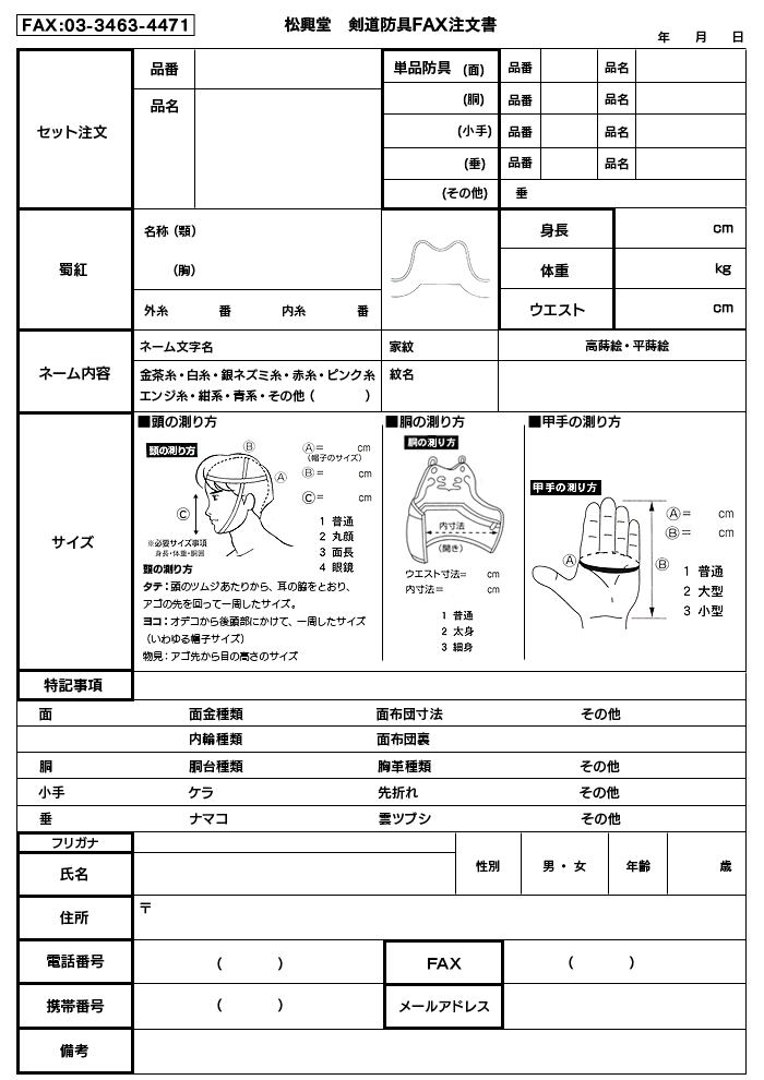 剣道具、剣道着(衣)など総合武道具の株式会社松興堂です。武道具のことならお任せください!! |剣道防具FAX注文書
